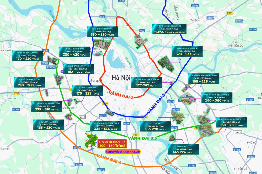 Dự án Khu vực Giá bán (triệu/m²) Ghi chú Thanh Hà – Cienco 5 Hà Đông – Thanh Oai 100 – 160 Gần khu thể thao Olympic The Manor Central Park Nguyễn Xiển 328 – 533 Cao cấp bậc nhất Hà Nội Hado Charm Villas An Khánh 210 – 260 Gần Đại lộ Thăng Long Vinhomes Ocean Park 1–3 Gia Lâm 150 – 360 Đại đô thị ven sông Hồng Khoảng cách giữa Thanh Hà và khu Nguyễn Xiển chỉ vài km, nhưng chênh lệch giá lên đến hơn 300 triệu/m², khiến nơi đây được ví như “vùng giá chưa thức tỉnh” – một trong những điểm đầu tư có biên độ tăng giá cao nhất thủ đô.